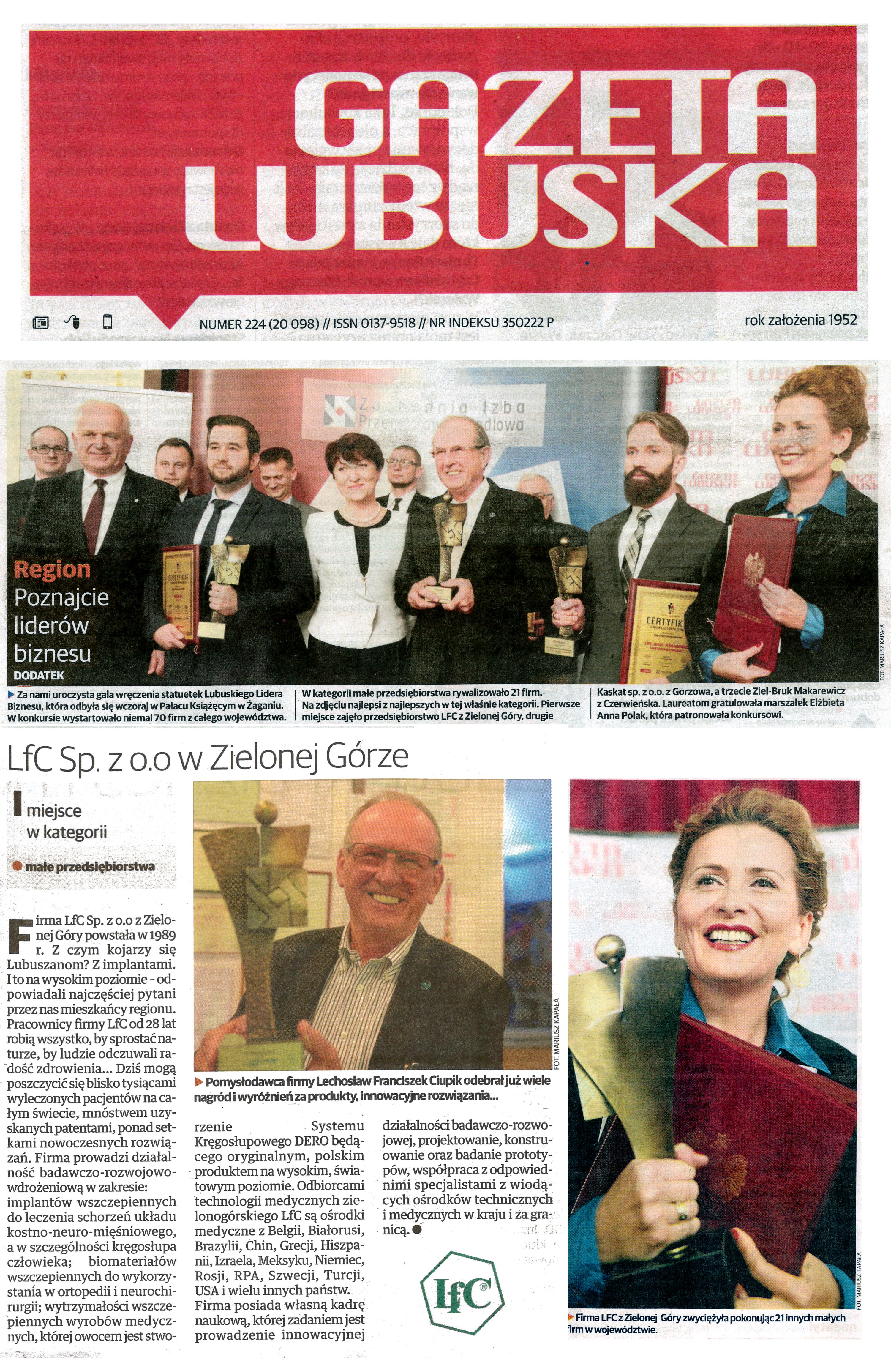 W przemówieniach inaugurujących wręczenie Nagród podkreślano, że to wyróżnienie jest przyznawane za „szczególne kompetencje i umiejętności oraz ciężką pracę”. Firma LfC jest zaszczycona, że znalazła się w tak wyróżnionym gronie lubuskich firm i ogromnie cieszy się, że doceniono jej wkład w rozwój polskiej gospodarki, zwłaszcza medycyny, w tym w upowszechnianiu opracowanych innowacyjnych metod chirurgicznych. Do tej pory wyleczono już implantami LfC ponad 70 000 pacjentów w Polsce i na świecie.