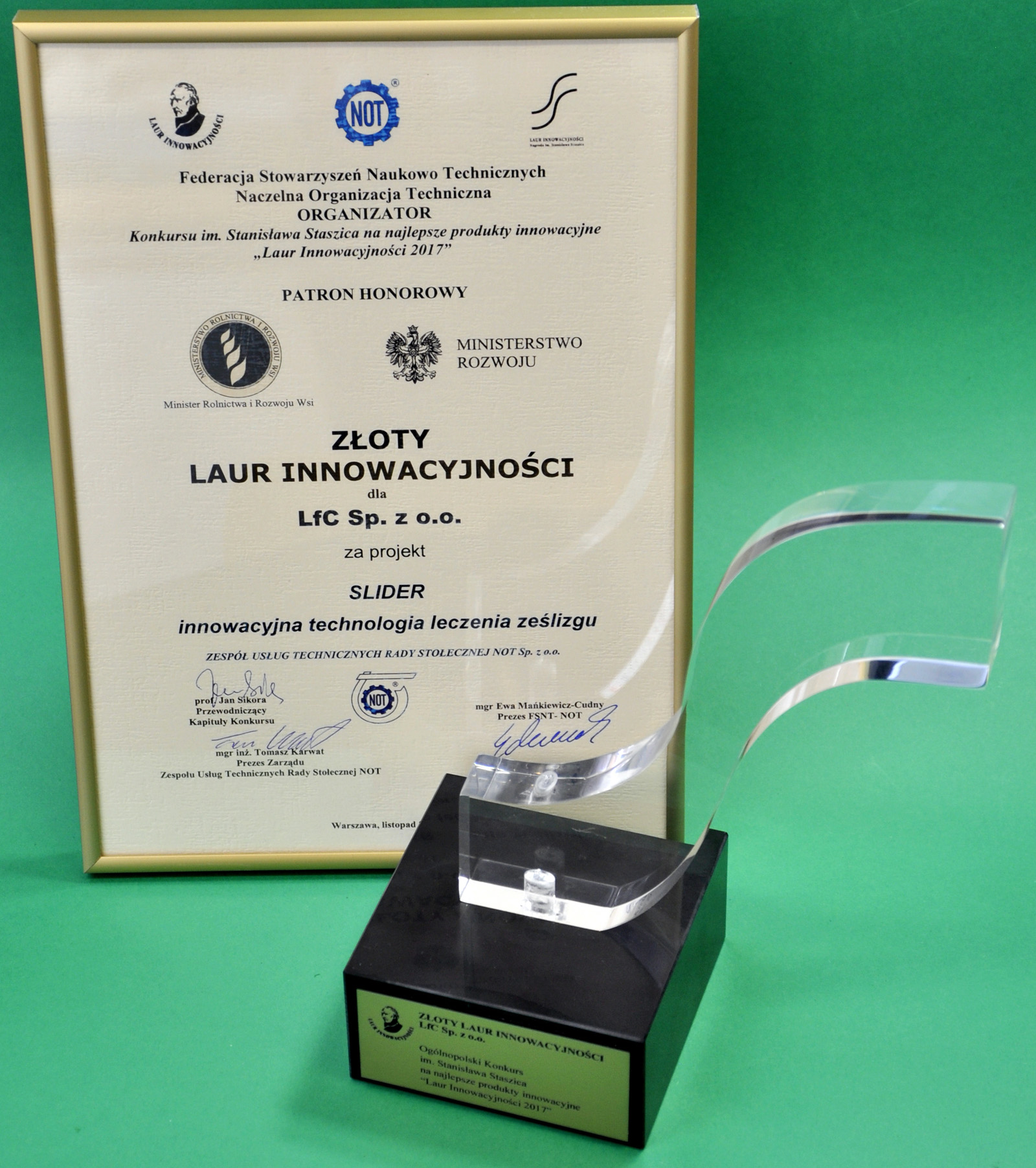 14 listopada br. w Warszawskim Domu Technika FSN-T NOT w Warszawie odbyła się Gala Finałowa Konkursu Laur Innowacyjności 2017, podczas której na ręce Prezesa LfC Lechosława F. Ciupika złożono nagrodę Złoty Laur Innowacyjności za projekt SLIDER – innowacyjna technologia leczenia ześlizgu.