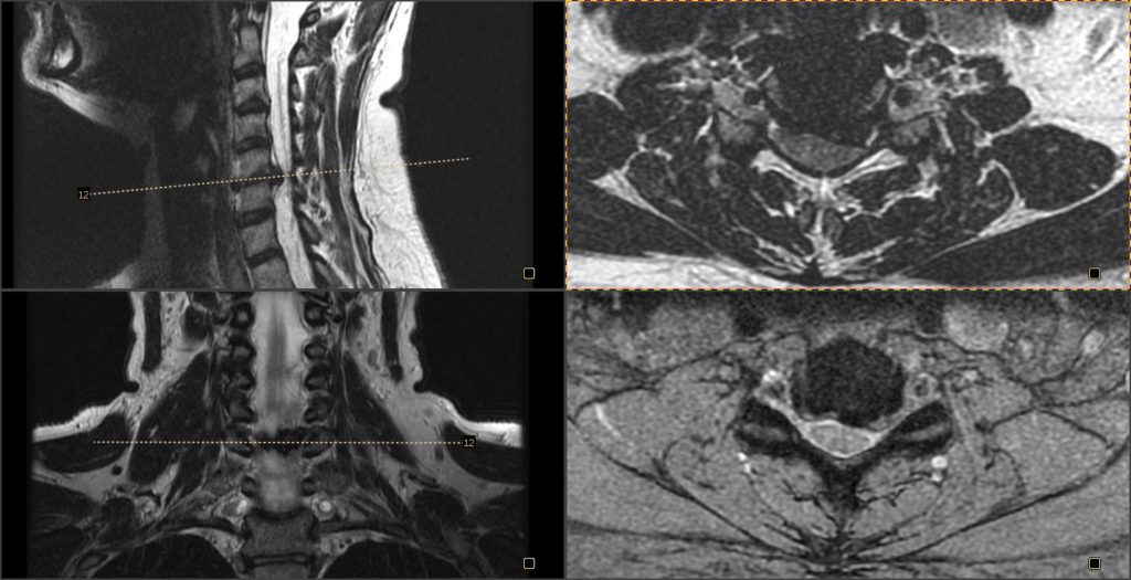 Dolegliwości pojawiły się ok. 6 miesięcy wcześniej i obejmowały ból promieniujący od lewego barku, przez ramię i przedramię dochodząc do kciuka. Chora negowała zaburzenia chodu oraz funkcji zwieraczy. Pacjentka była rehabilitowana /fizyko- i fizjoterapia/ – bez efektu. W badaniu MRI uwidoczniono centralno-lewoboczną przepuklinę jądra miażdżystego krążka C5/C6 wypełniającą lewy zachyłek boczny, bez towarzyszących zmian śródrdzeniowych, ani zaawansowanych zmian zwyrodnieniowych sąsiadujących segmentów. W chwili przyjęcia zwracały uwagę (+) objaw szczytowy po stronie lewej z towarzyszącym, śladowym osłabieniem siły mięśniowej mięśnia dwugłowego ramienia oraz mięśni kłębu kciuka. Czucie dotyku zachowane