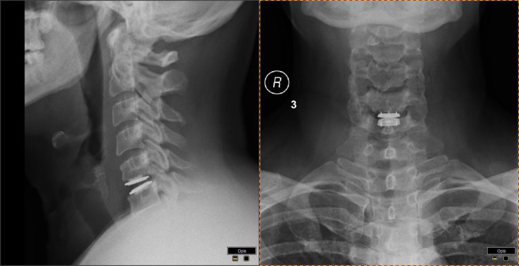 Po zabiegu chora zgłaszała całkowite ustąpienie dolegliwości bólowych o charakterze korzeniowym; utrzymywał się ból osiowy w obrębie kręgosłupa szyjnego, stopniowo ustępujący. Kontrolne badanie RTG potwierdziło prawidłowe położenie protezy. W dobrym stanie ogólnym i neurologicznym, z raną w fazie prawidłowego gojenia, pacjentkę wypisano do domu.