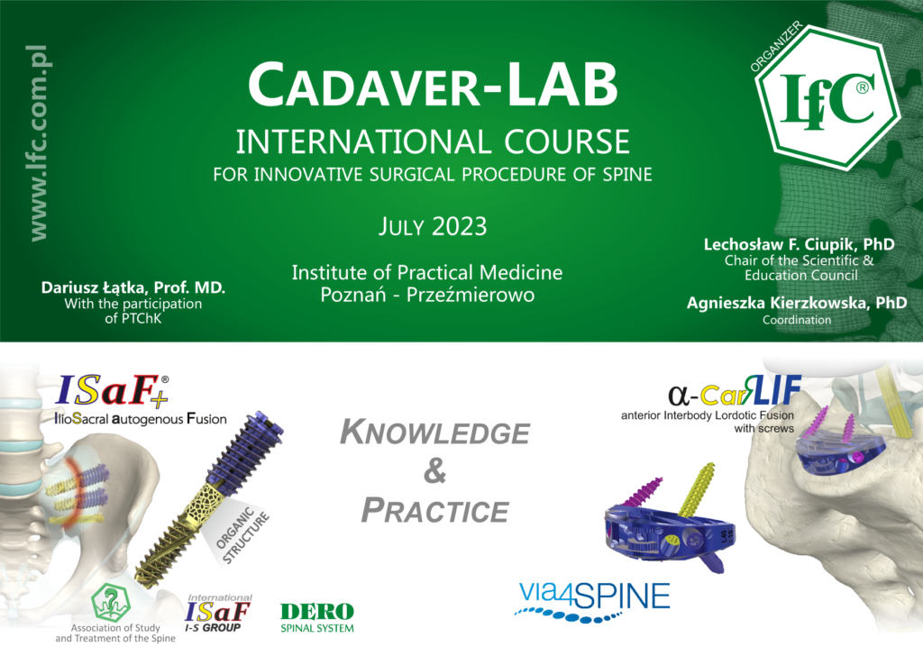 In July, the fifth Cadaver-Lab (DERO-LfC) course, certified with educational credits, took place at the Medical Education Center in Warsaw. The subject of the training was a new procedure for sacroiliac stabilization: ISaF – Ilio-Sacral Stabilization (with) autogenous Fusion.