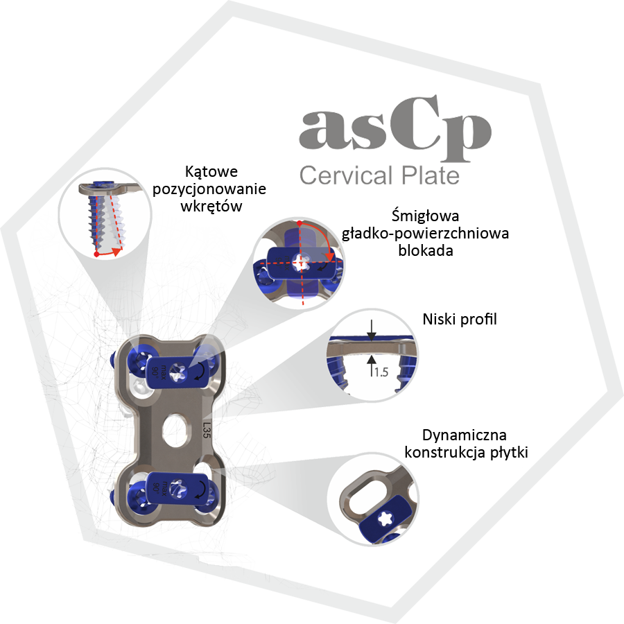 ”as·C·p” (airscrew Cervical plate) jest płytką szyjną, której anatomiczny kształt oraz „śmigiełkowa” blokada wkrętów stawia ją wśród najbardziej unikatowych na rynku. Wstępnie dogięta ułatwia chirurgowi dopasowanie lub odtworzenie lordozy szyjnej w płaszczyźnie poprzecznej i podłużnej. „Śmigiełkowa” blokada wkrętów oraz owalne otwory w płytce zapewniają dogodne mocowania stabilizatora, jak również jego dynamiczne dostosowanie pooperacyjne (nie przesztywnia układu). Płytka dostępna jest w dwóch typach – symetryczna i asymetryczna – oraz w wielu wariantach wymiarowych (długości i grubości). Wkręty szyjne są samogwintujące i dostępne w różnych średnicach i długościach.