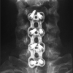 Implanted: titanium vertebral body prosthesis supported with cervical plate asCp with cervical screws