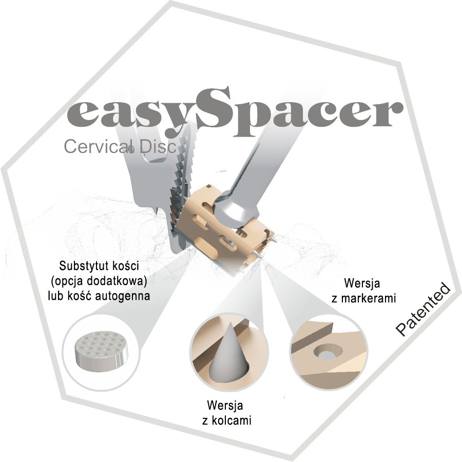 Koszyk szyjny easySpacer przeznaczony do protezowania trzonów kręgosłupa szyjnego, zbudowany jest z biopolimeru PEEK-OPTIMA o module sprężystości zbliżonym do kości. Posiada perforowany korpus, dwie karbowane powierzchnie styku z trzonami wraz z 4 tytanowymi kolcami na każdej z nich. Kolce umożliwiają pewniejsze utwierdzenie w blaszce granicznej trzonu, zabezpieczając wszczep przed wypadnięciem. Duża przelotowa przestrzeń wewnętrzna pozwala na wypełnienie implantu przeszczepem kostnym lub substytutem kości, co sprzyja przerostom i powstawaniu spondylodezy. Znajdujący się w środku protezy ruchomy element służy do współpracy z narzędziem instalacyjnym oraz umożliwia połączenie z płytką szyjną. Szczególnie przygotowane instrumentarium zapewnia bezpieczną „ślizgową” procedurę wszczepiania implantu przez jednego chirurga.