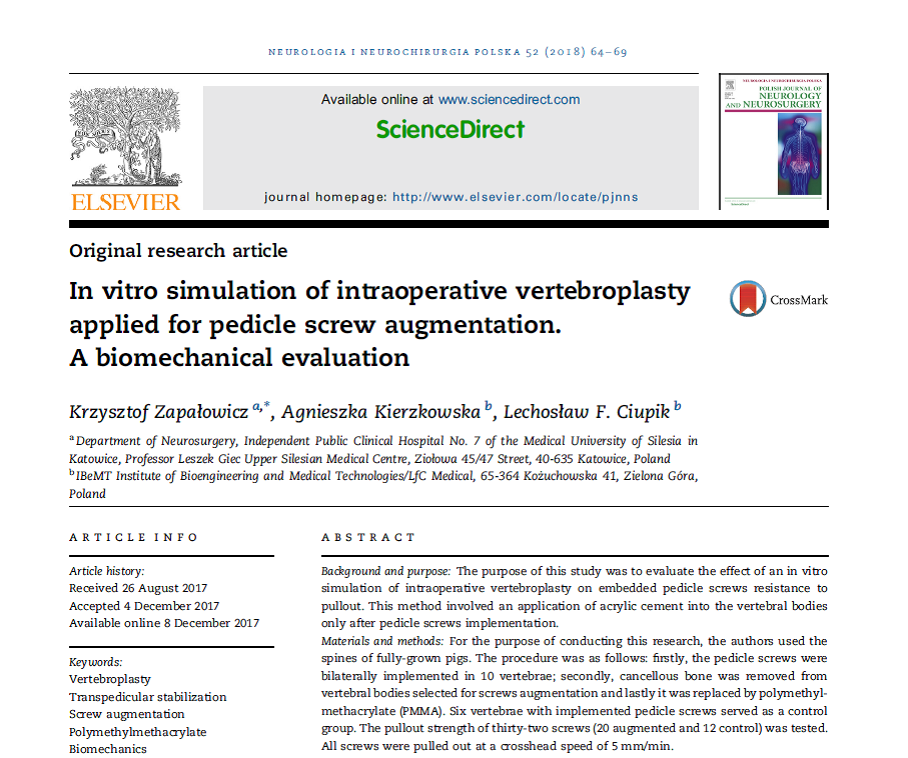 Dotychczasowe wyniki zostały dobrze ocenione przez recenzentów, czego przykładem jest m.in. wysokopunktowana publikacja naukowa w Neurologii i Neurochirurgii Polskiej ze stycznia 2018 pt. „In vitro simulation of intraoperative vertebroplasty applied for pedicle screw augmentation. A biomechanical evaluation”.